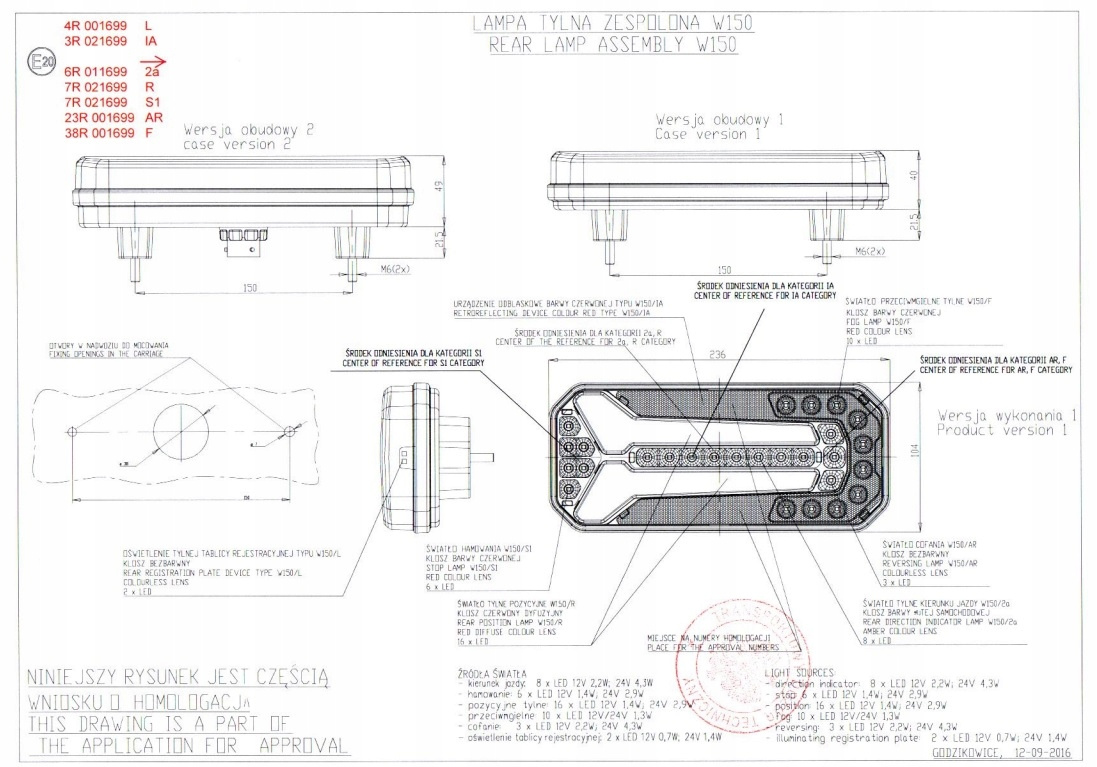 LAMPA TYLNALAMPA TYŁ L/P W150DD (LED, 12/24V, Z KIERUNKOWSKAZEM, ZE ŚWIATŁEM PRZECIWMGIELNYM, ZE ŚWIATŁEM STOPU, ŚWIATŁO POZYCYJNE, Z PODŚWIETLENIEM TABLICY, ODBLASK, DYNAMICZNY KIERUNKOWSKAZ, Z PRZELOTKĄ NA PRZInformacje dodatkowe: Gwarantowana jakość