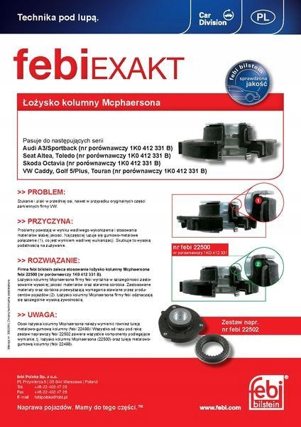 GÓRNE MOCOWANIE AMORTYZATORAPODUSZKA KOLUMNY MC PHERSONA PRZÓD L/P (Z ŁOŻYSKIEM) PASUJE DO: AUDI A3, Q3, TT, SEAT ALTEA, ALTEA XL, LEON, TOLEDO III, SKODA OCTAVIA I, OCTAVIA II, SUPERB II, YETI, VW BEETLE 1.0-3.6 02.03-Informacje dodatkowe: Gwarantowana