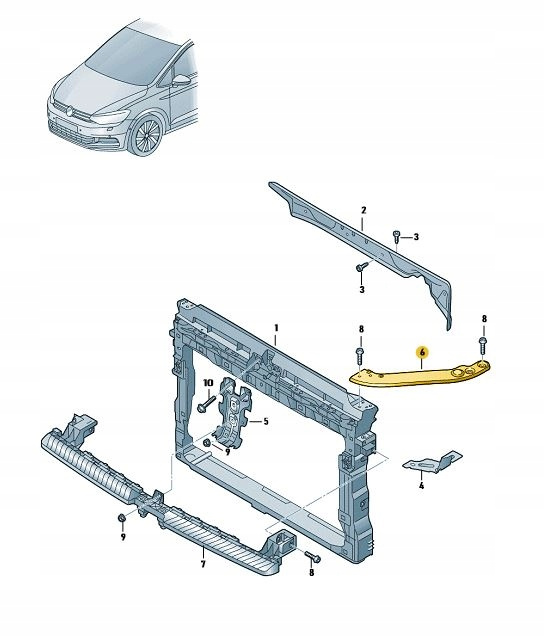 Oryginalna podpora pasa przedniego montowana po lewej stronie pojazdu. Element stanowi część konstrukcji przedniego pasa i odpowiada za prawidłowe mocowanie elementów frontu pojazdu, takich jak wzmocnienie pasa przedniego, zderzak czy elementy układu chłodzenia.